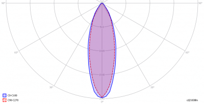 An interesting graph is the light diagram, indicating the intensity in the C0-C180 and the C90-C270 plane. This light diagram below comes from the program Qlumedit, that extracts these diagrams from an Eulumdat file.