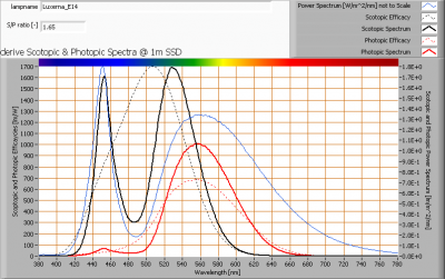 The power spectrum, sensitivity curves and resulting scotopic and photopic spectra (spectra energy content defined at 1 m distance).