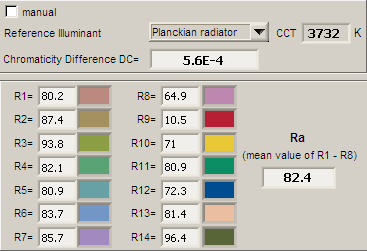 Herewith the image showing the CRI as well as how well different colors are represented (rendered). The higher the number, the better the resemblance with the color when a black body radiator would have been used (the sun, or an incandescent lamp). Practical information and also some critics about the CRI can be found on the OliNo website.