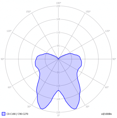 This radiation pattern is the average of the light output of the light diagram given earlier. Also, in this graph the luminous intensity is given in Cd.