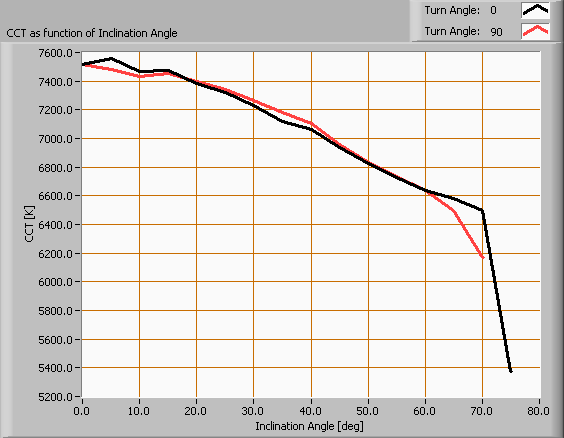 The measurement of CCT is measured for inclination angles up to 70º as beyond that angle the illuminance values are very low (< 5 lux).