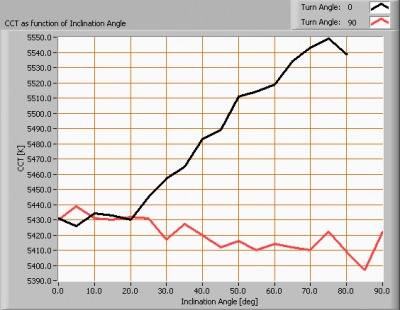 The measurement of CCT is measured for inclination angles up to 80º as beyond that angle the illuminance values are very low (< 5 lux).