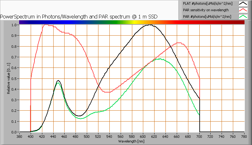 The photon spectrum, then the sensitivity curve and as result the final PAR spectrum of the light of this light bulb