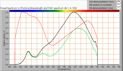 The photon spectrum, then the sensitivity curve and as result the final PAR spectrum of the light of this light bulb