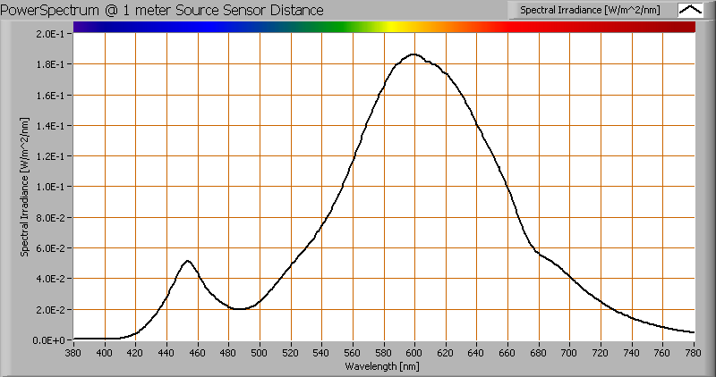 The spectral power distribution of this light bulb, energies on y-axis valid at 1 m distance.
