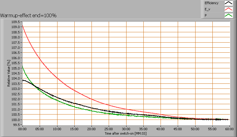 After switch on of a cold lamp, the effect of heating up of the lamp is measured on illuminance E_v [lx], the lamppower P [W] and the luminous efficacy [lm/W].