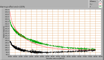 After switch on of a cold lamp, the effect of heating up of the lamp is measured on illuminance E_v [lx], the lamppower P [W] and the luminous efficacy [lm/W].