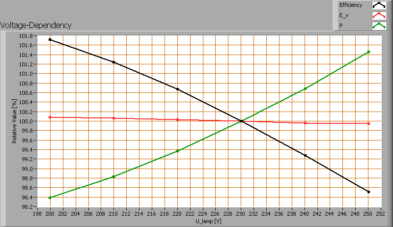 The dependency of a number of lamp parameters on the lamp voltage is determined. For this, the lamp voltage has been varied and its effect on the following light bulb parameters measured: illuminance E_v [lx], the lamppower P [W] and the luminous efficacy [lm/W] (this latter is estimated here by dividing the found E_v value by P).
