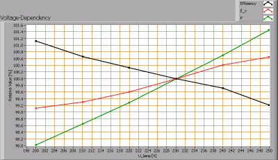 After switch on of a cold lamp, the effect of heating up of the lamp is measured on illuminance E_v [lx], the lamppower P [W] and the luminous efficacy [lm/W].