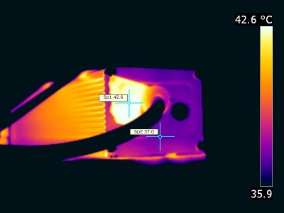 The 42.6 degrees C is correct (emissivity of 0.95 of the tape). Measuring direct on the metal of the power supply case gives a lower value as it reflects more of the ambient temperature.