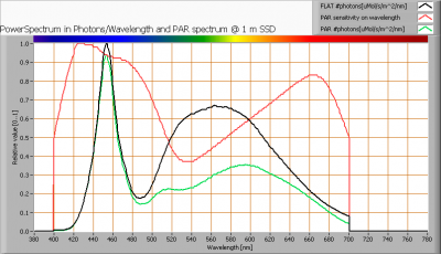 The photon spectrum, then the sensitivity curve and as result the final PAR spectrum of the light of this light bulb