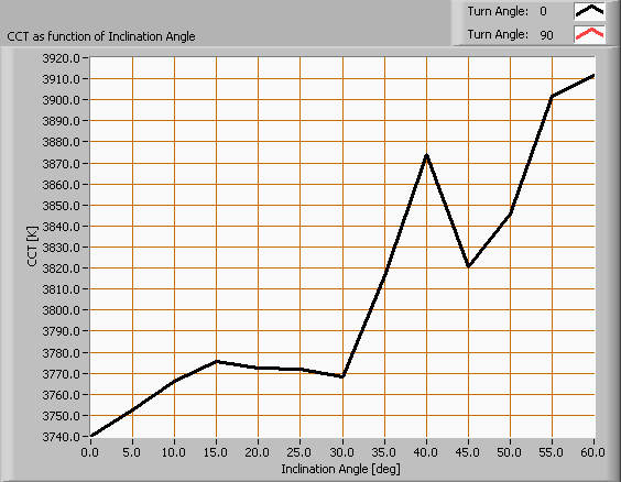 This color temperature is measured straight underneath the light bulb. Below a graph showing the color temperature for different inclination angles.