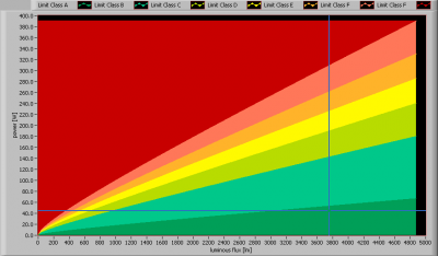 With the measurement results of the luminous flux and the consumed power the classification on energy efficacy of this lamp is calculated. This information is requested in the EU for certain household lamps, see also the OliNo site that explains for which lamps it is requested, how the label looks like and what information it needs to contain.