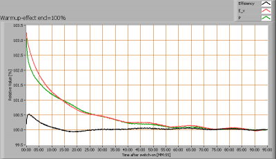 After switch on of a cold lamp, the effect of heating up of the lamp is measured on illuminance E_v [lx], the lamppower P [W] and the luminous efficacy [lm/W].