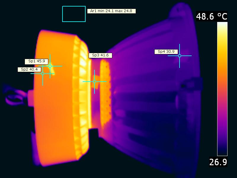 The temperature of the housing gets maximally about 21 degrees hotter than ambient temperature. Warm up effect: During the warmup time the illuminance varies during 29 minutes and decreases with 13 %. Voltage dependency: There is no (significant) dependency of the illuminance when the power voltage varies between 200 – 250 V AC. At the end of the article an additional photo. |