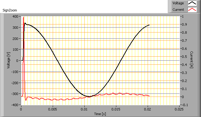 The inrush current has been measured for different voltage start angles; from 0 – 170 degrees with a 10 degrees step. The current- and voltage values have been acquires at a sample speed of 39.9 kS/s. Then this data has been fed into a second order 2kHz low pass Butterworth filter. This removes the current spikes that do not represent relevant values.