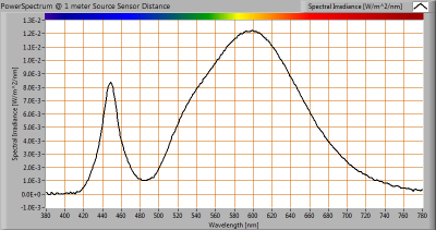 The spectral power distribution of this light bulb, energies on y-axis valid at 1 m distance.