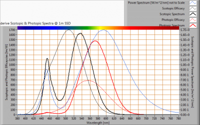 The power spectrum, sensitivity curves and resulting scotopic and photopic spectra (spectra energy content defined at 1 m distance).