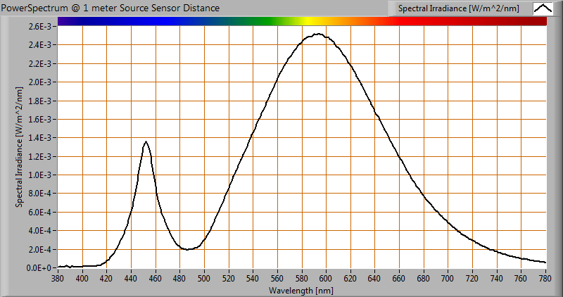 The spectral power distribution of this light bulb, energies on y-axis valid at 1 m distance.