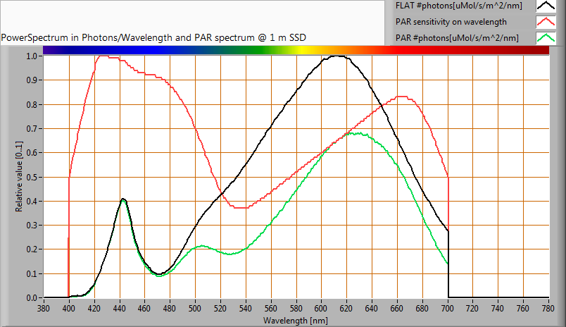 The PAR efficiency is 64 % (valid for the PAR wave length range of 400 – 700 nm). This is the maximum percentage of the total of photons in the light that is effectively used by the average plant (since the plant might not take 100 % of the photons at the frequency where its relative sensitivity is 100 %).