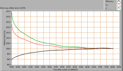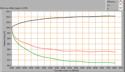 After switch on of a cold lamp, the effect of heating up of the lamp is measured on illuminance E_v [lx], the lamppower P [W] and the luminous efficacy [lm/W].