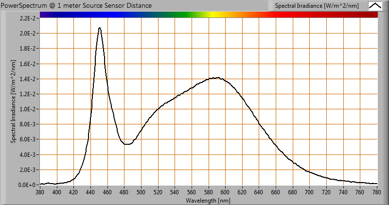 The spectral power distribution of this light bulb, energies on y-axis valid at 1 m distance.