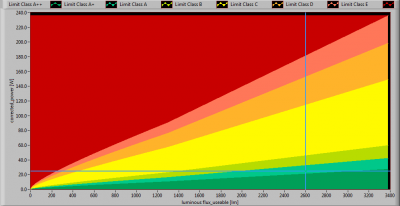 The lamp’s performance in the lumen-Watt field, with the energy efficacy fields indicated.