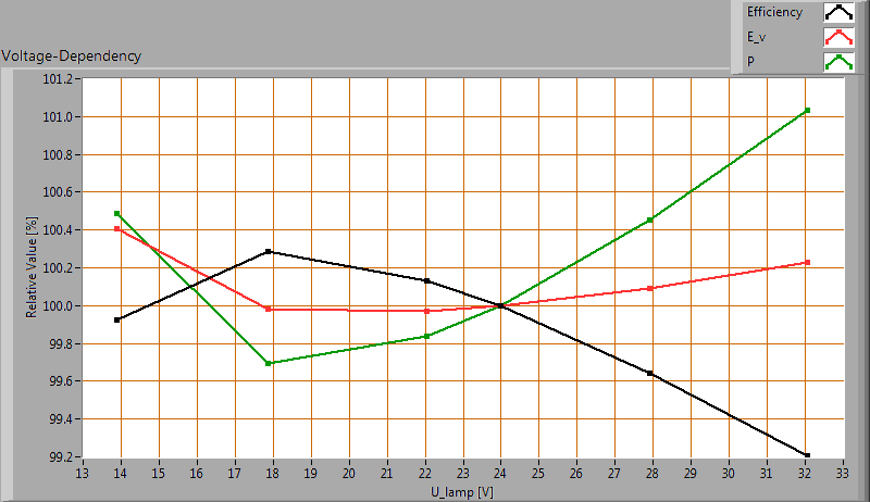 After switch on of a cold lamp, the effect of heating up of the lamp is measured on illuminance E_v [lx], the lamppower P [W] and the luminous efficacy [lm/W].