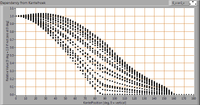 This plot shows per inclination angle the intensity measurement results for each turn angle at that inclination angle. There normally are differences in illuminance values for different turn angles. However for further calculations the averaged values will be used.