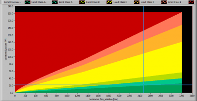 The lamp’s performance in the lumen-Watt field, with the energy efficacy fields indicated.