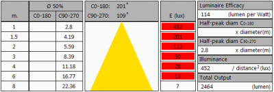 Please note that this overview table makes use of calculations, use this data with care as explained on the OliNo site. E (lux) values are not accurate, when within 5 x 1470 mm (maximal luminous size, eventually diagonally measured)= 7350 mm. Within this distance from the lamp (data given in red), the measured lux values will be less than the computed values in this overview as the measurements are then within the near field of the lamp.