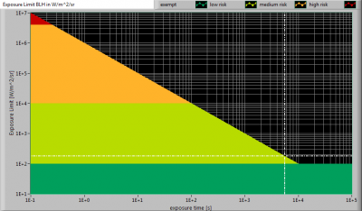 | Belichtungswert [W/m^2/sr] | 1.77E+2 | Blaues Lichtgefahr-Wert für diese Lampe, gemessen direkt unter der Lampe. Die Berechnung ist bezogen auf Lb. |