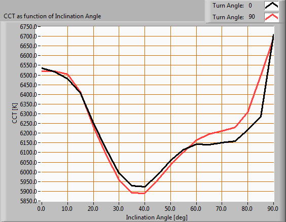 Die Farbtemperatur wird für verschiedene Kippwinkel bis 90 Grad gemessen. Ausserhalb is nicht mehr gemessen.