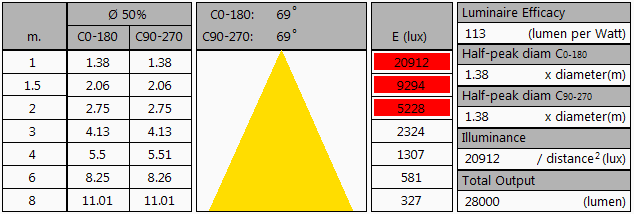 Mit den Messwerten in Lux auf 1 Meter Abstand aus dem Strahlungsdiagramm der mittleren Lichtstärken lässt sich der Lichstrom berechnen. Das sind für diese Lampe 28000 Lumen.