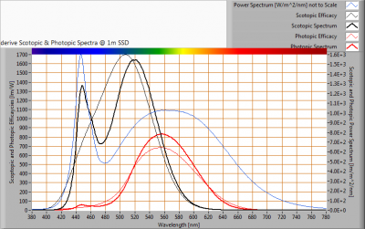 The power spectrum, sensitivity curves and resulting scotopic and photopic spectra (spectra energy content defined at 1 m distance).