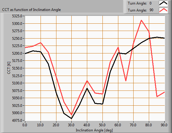 The color temperature is given for inclination angles up to 90 deg. Beyond that angle has not been measured.