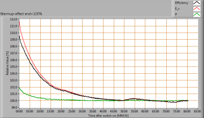 After switch on of a cold lamp, the effect of heating up of the lamp is measured on illuminance E_v [lx], the lamppower P [W] and the luminous efficacy [lm/W].