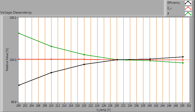 After switch on of a cold lamp, the effect of heating up of the lamp is measured on illuminance E_v [lx], the lamppower P [W] and the luminous efficacy [lm/W].
