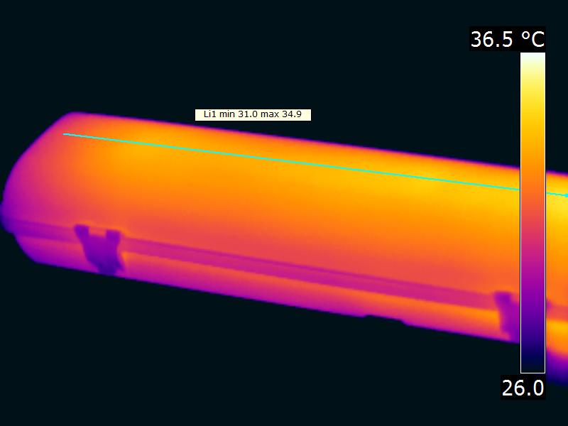 | General remarks | The ambient temperature during the whole set of illuminance measurements was 25.6 – 25.9 deg C.The temperature of the lamp gets maximally about 11 degrees hotter than ambient temperature.Warm up effect: During the warmup time the illuminance doesn’t vary significantly (< 5 %).During the warmup time the power doesn’t vary significantly (< 5 %). The variation in efficacy (calculated as indication by simplydividing the illuminance by the power) during the warming up is -2 %. A very high negative value indicates a significant decrease for instance due to heating up of the lamp (decrease of lifetime). Voltage dependency: There is no (significant) dependency of the illuminance when the power voltage varies between 200 – 250 V AC. At the end of the article an additional photo. |