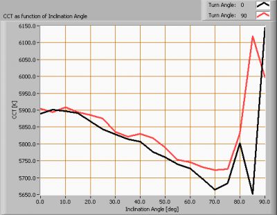 The color temperature is given for inclination angles up to 90 deg. Beyond that angle has not been measured.