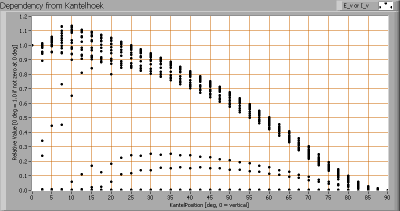 This plot shows per inclination angle the intensity measurement results for each turn angle at that inclination angle. There normally are differences in illuminance values for different turn angles. However for further calculations the averaged values will be used.