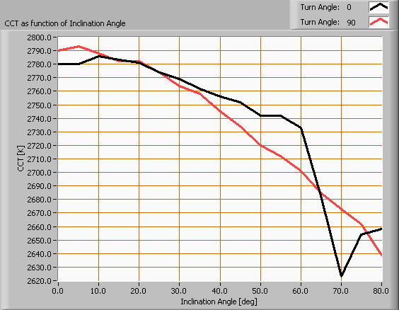 The color temperature is given for inclination angles up to 80 deg. Beyond that value the illuminance is so low (< 0.10 lux) that it has not been used for color determination of the light.