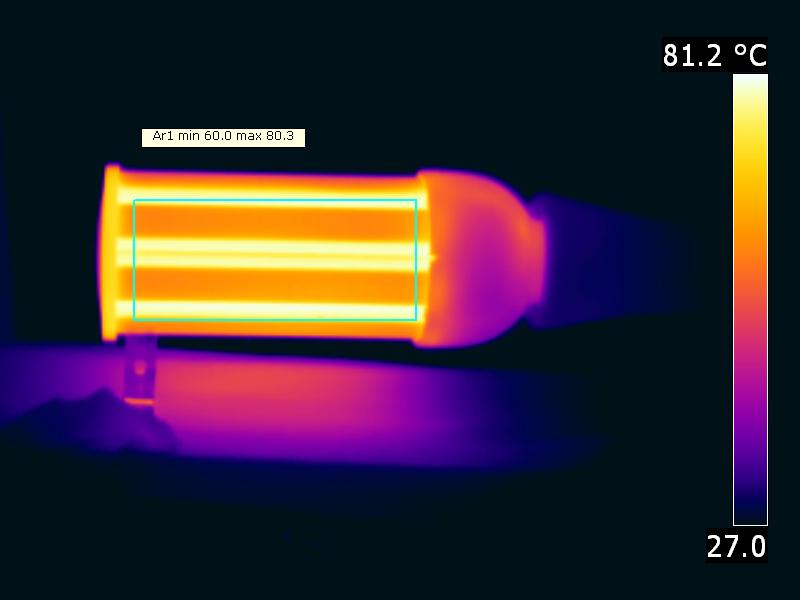 | Allgemeine Bemerkungen | Die Umgebungstemperatur wahrend der Messungen war 24.9 – 25.7 °C.Die Lampe wird maximal etwa 55.5 Grad wärmer als die Umgebung.Aufwärmeffekt: Während des Aufwärmens ändert sich die Beleuchtungsstärke während 27 Minuten und nimmt ab mit 7 %. Während des Aufwärmens ändert sich die Leistungsaufnahme nicht signifikant (weniger als 5 %). Die Veränderung in der Wirksamkeit (hier nur eine Indikation weil sie berechnet ist durch eine Teilung zwischen Beleuchtungssträrke und Leistung) während der Aufwärmphase ist -5 %. Ein sehr hoher negativer Wert zeigt eine signifikante Abnahme zum Beispiel aufgrund von Aufheizen der Lampe (Abnahme der Lebensdauer).Abhängigkeit der Spannung: Es gibt keine (bedeutende) Abhängingkeit von der Beleuchtungsstärke wenn die Versorgungsspannung variiert zwischen 200 – 250 V AC. Es gibt keine (bedeutende) Abhängingkeit von der Leistung wenn die Versorgungsspannung variiert zwischen 200 – 250 V AC.Am Ende dieses Artikels steht noch ein extra Detailfoto. |