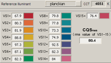 | Farbqualitätsskala | 80.4 | Die Farbqualitätsskala (englisch Color quality scale, CQS, besser als die CRI_Ra) bezeichnet ein quantitatives Verfahren zur Bestimmung der Farbwiedergabe einer Lichtquelle. |