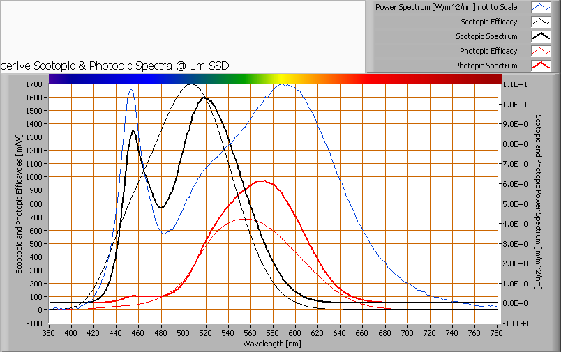 Das Leistungsspektrum, die Empfindlichkeitskurven und die daraus resultierenden Tag- und Nachtsichtspektra auf 1 Meter Abstand.