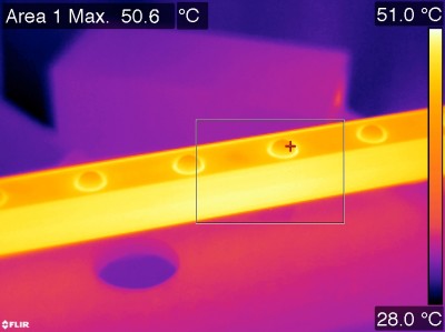 präsentiert eine LED-Leiste. Die Messungen von OliNo zeigen, dass die Lampe ein kaltweisses Licht mit 5974 K Farbtemperatur abgibt. Die Lampe verbraucht 21.6 W an Leistung und produziert einen Lichtstrom von 1653 Lumen. Damit hat sie einen Wirkungsgrad von 77 lm/W und fällt in die Energielabel Kategorie A.