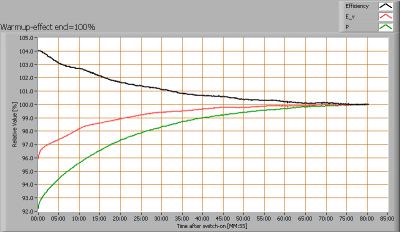 Die Veränderung in der Wirksamkeit (hier nur eine Indikation weil sie berechnet ist durch eine Teilung zwischen Beleuchtungssträrke und Leistung) während der Aufwärmphase ist -4 %. Ein sehr hoher negativer Wert zeigt eine signifikante Abnahme zum Beispiel aufgrund von Aufheizen der Lampe (Abnahme der Lebensdauer).