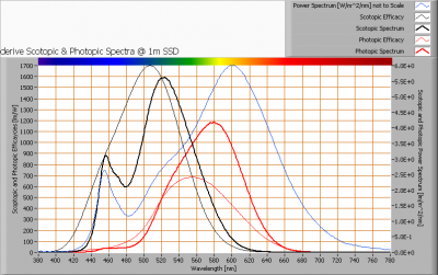 The power spectrum, sensitivity curves and resulting scotopic and photopic spectra (spectra energy content defined at 1 m distance).