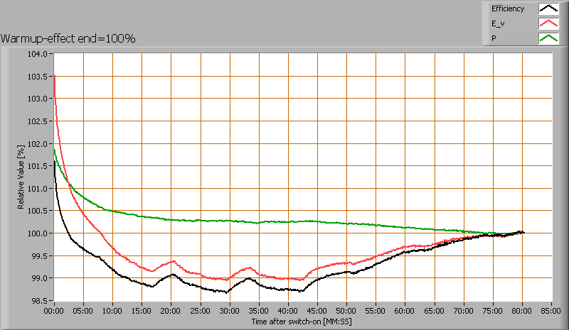 After switch on of a cold lamp, the effect of heating up of the lamp is measured on illuminance E_v [lx], the lamppower P [W] and the luminous efficacy [lm/W].