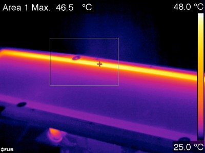 | General remarks | The ambient temperature during the whole set of illuminance measurements was 25.9 – 27.4 deg C.The temperature of the lamp gets maximally about 25.5 degrees hotter than ambient temperature.Warm up effect: During the warmup time the illuminance doesn’t vary significantly (< 5 %).During the warmup time the power doesn’t vary significantly (< 5 %). The variation in efficacy (calculated as indication by simplydividing the illuminance by the power) during the warming up is -2 %. A very high negative value indicates a significant decrease for instance due to heating up of the lamp (decrease of lifetime).Voltage dependency: There is no (significant) dependency of the illuminance when the power voltage varies between 200 – 250 V AC. There is no (significant) dependency of the consumed power when the power voltage varies between 200 – 250 V AC.At the end of the article an additional photo. |